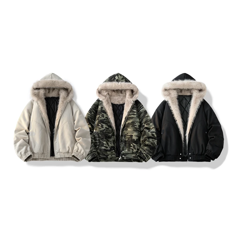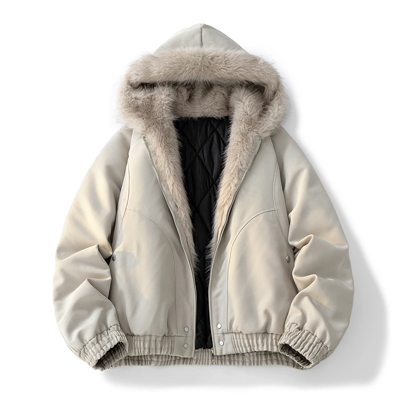 Retro Plus Size Hooded Parka Coat Fleece Collar Zipper Thick Loose Fit Autumn Winter