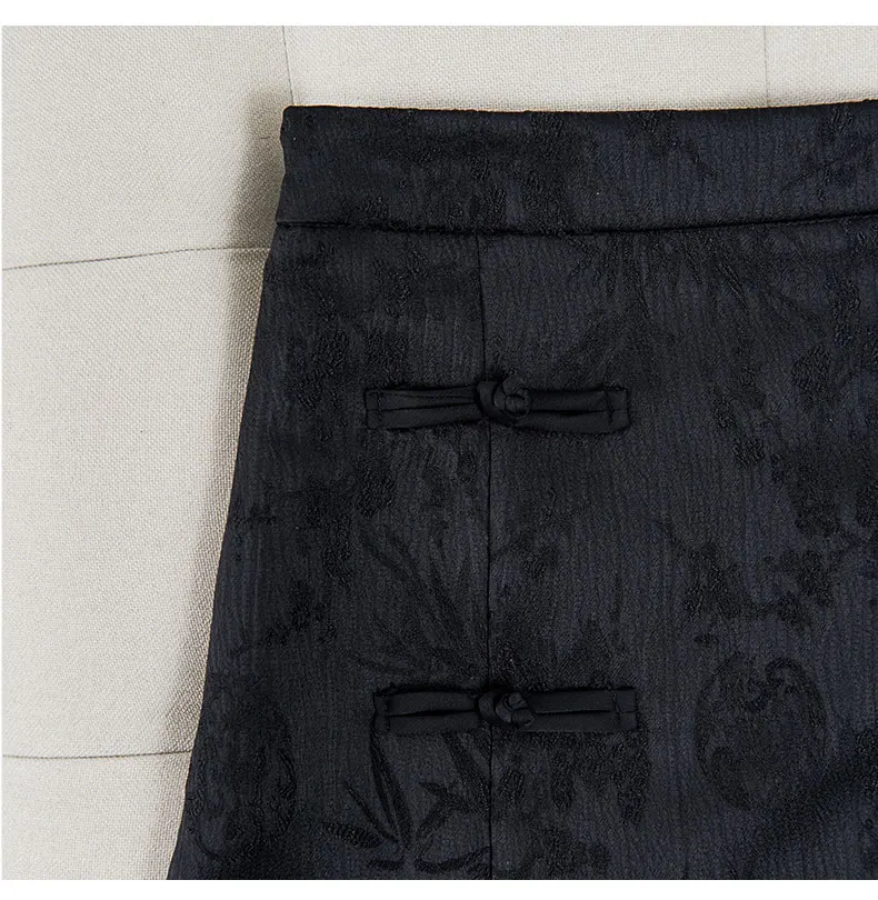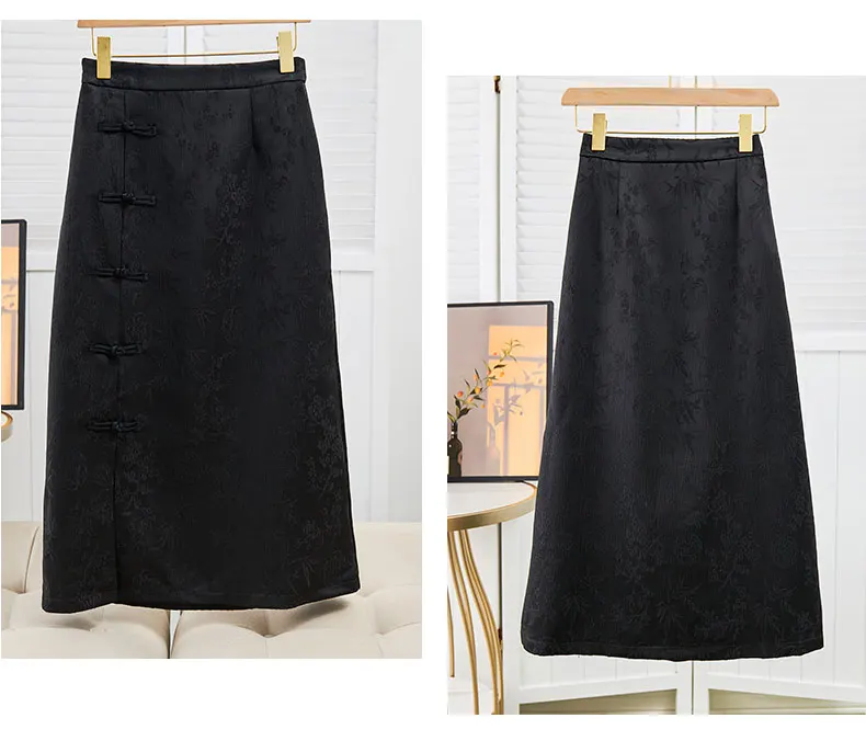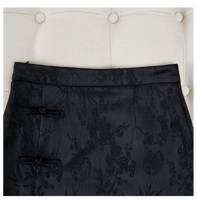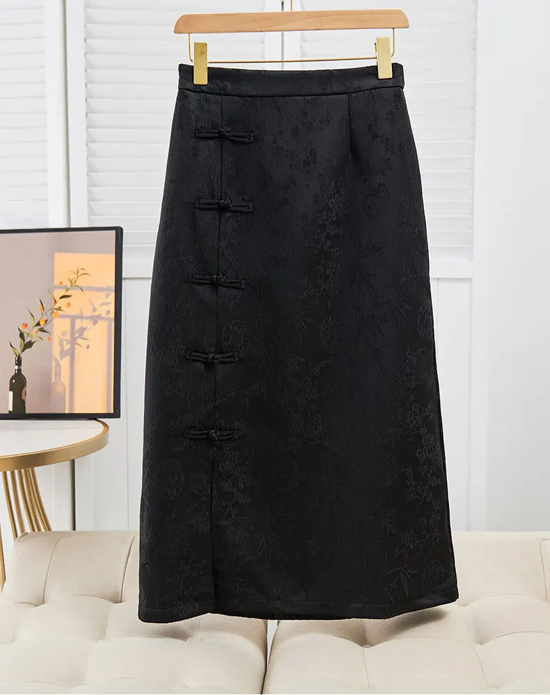 Vintage Jacquard High Waist Slim Long Skirt Chinese Style Side Slit Buckle