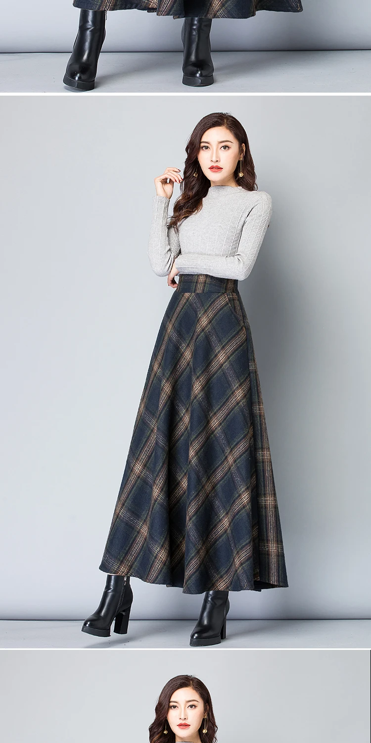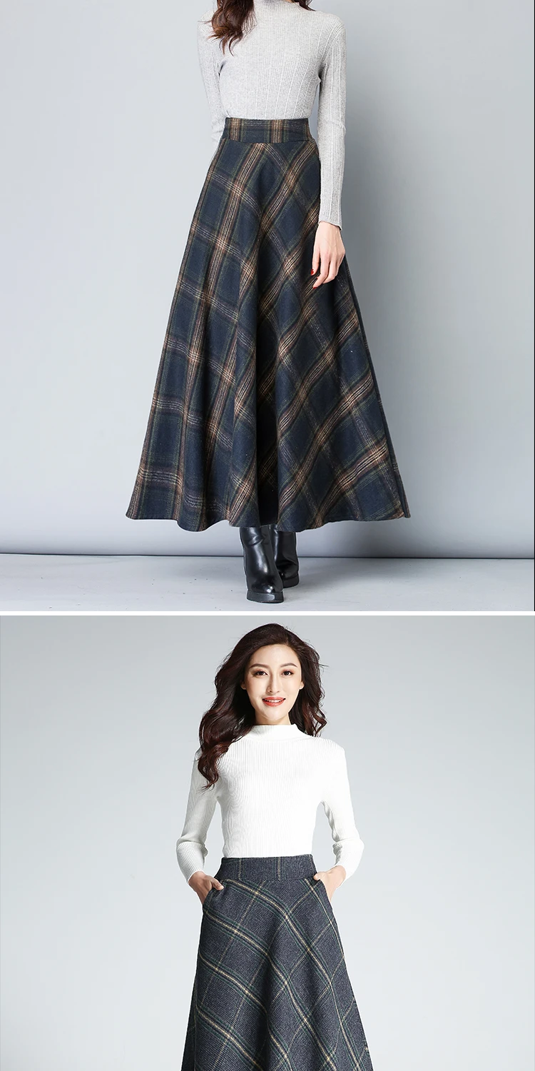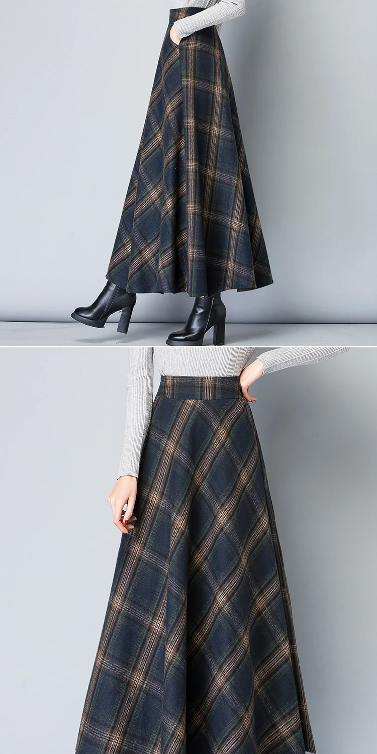 Women’s High Waist Plaid Long Skirt Thick Warm Elastic Autumn Winter Streetwear