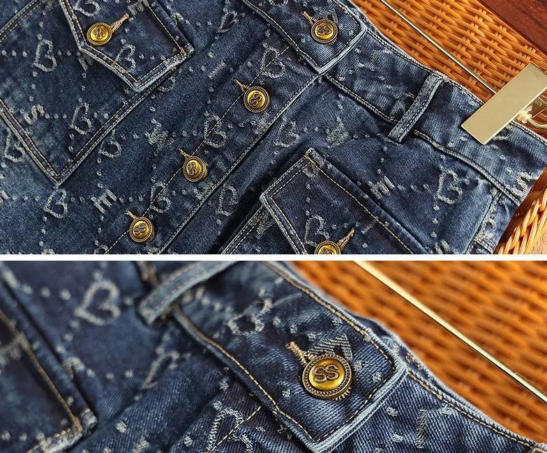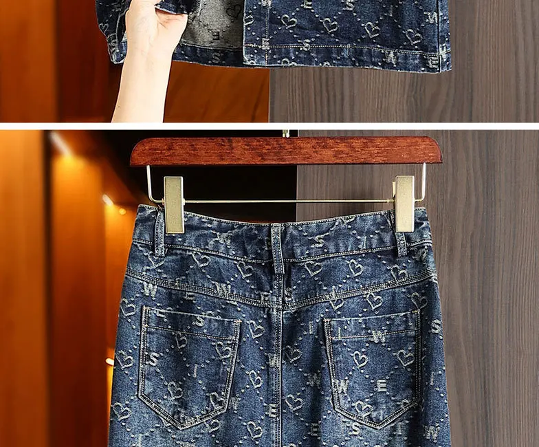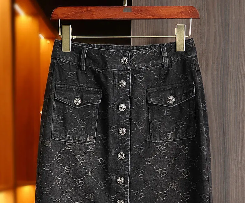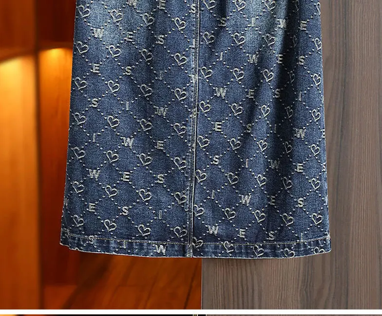 Women’s High Waist Slit Denim Midi Skirt A-Line Printed Hip Fit Autumn 2025